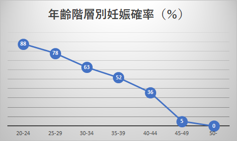 20代の前半では88%あった妊娠率が、40代の前半では36%に、40代の後半では5%にまで下がってしまいます。